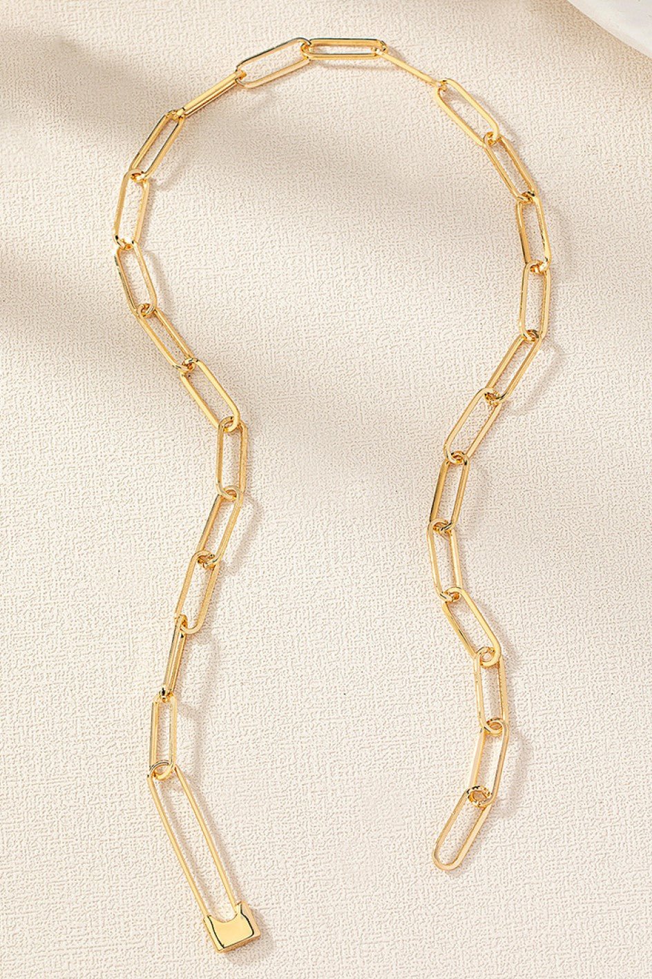 This necklace features a bold link chain design with a front-facing safety pin clasp detail, creating a modern, edgy statement look while remaining easy to layer.