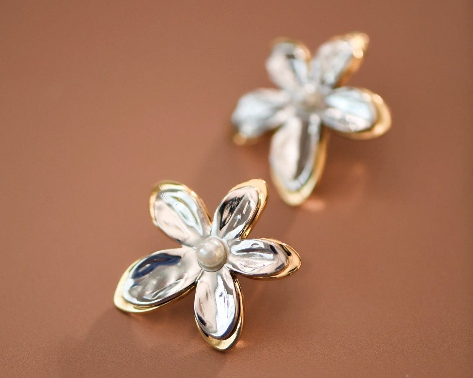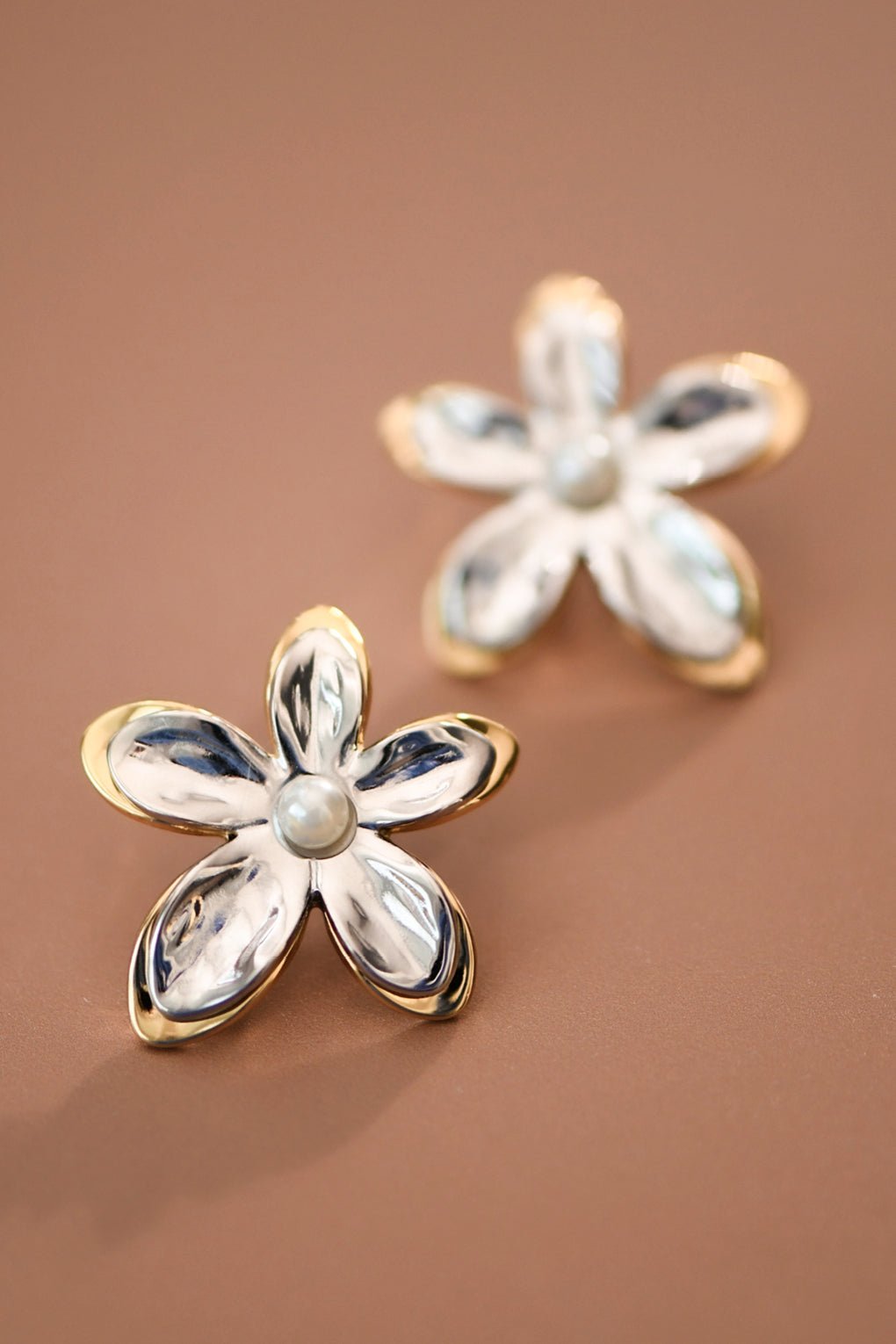 Pearl Statement Stud Earrings | Floral Stud Earrings | Gold Plated Stud Earrings | Stainless Steel Earrings | Two-Tone Earrings | Waterproof & Sweatproof Jewelry | Metal Earrings | Tarnish Resistant Earrings | Everyday Jewelry