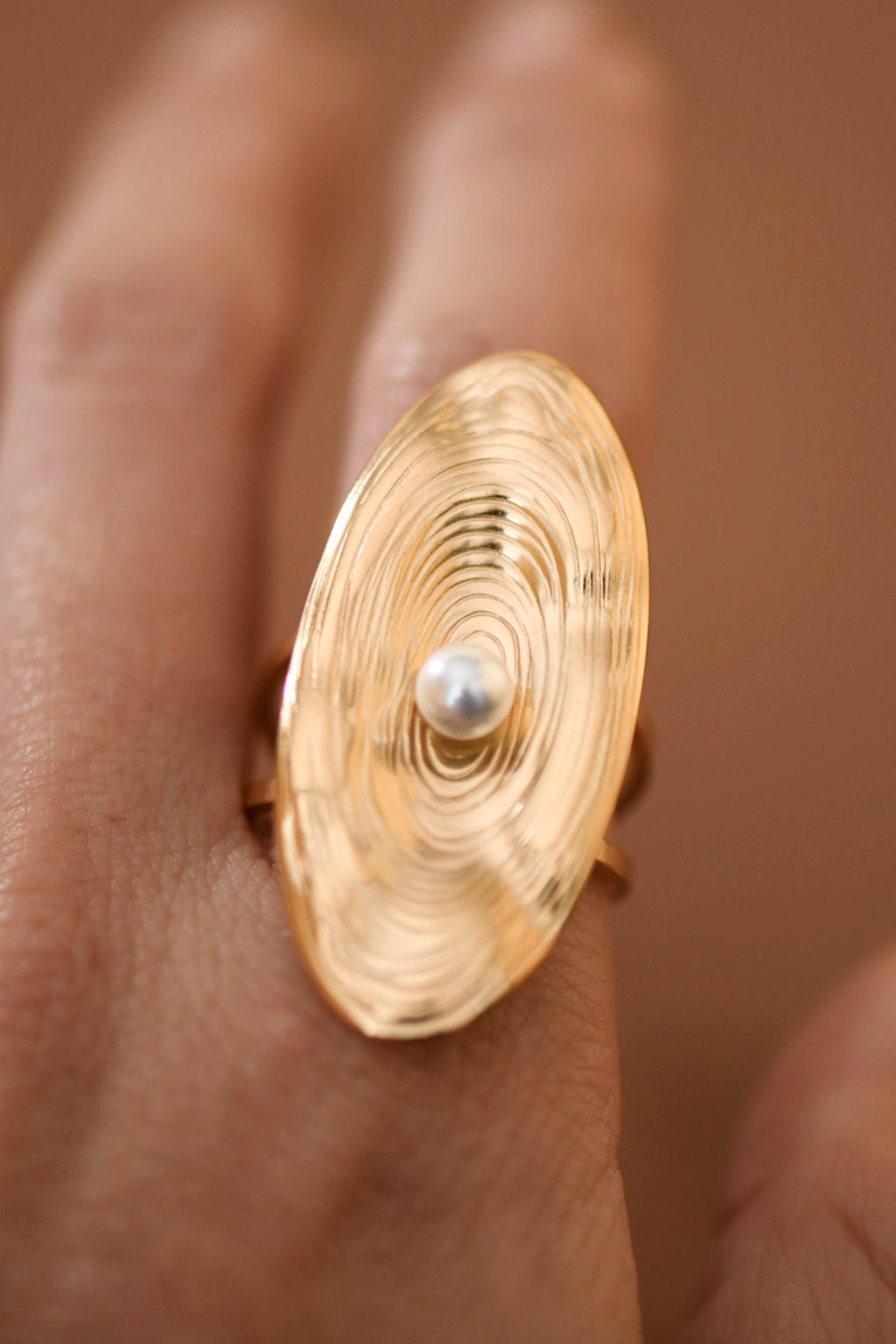 18K Gold Plated Stainless Steel Oval Ring with a Center Pearl Detail.