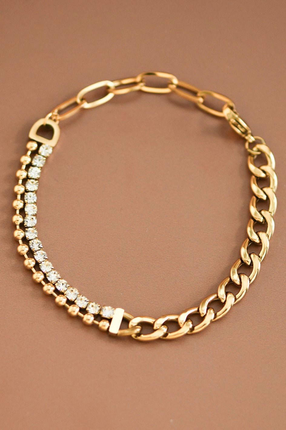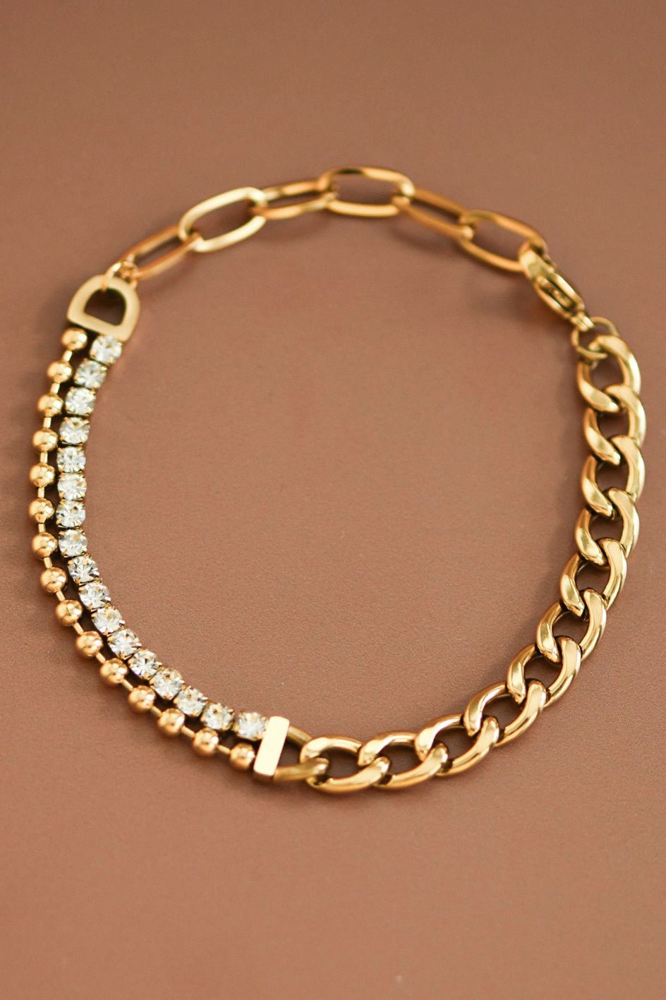 18K Gold Plated Stainless Steel Mixed Chain Bracelet with Clear Crystals.