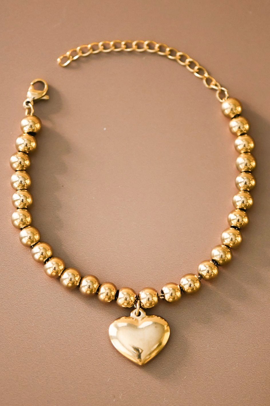 18K gold plated stainless steel beaded chain bracelet with heart charm.