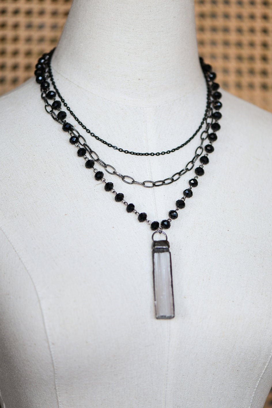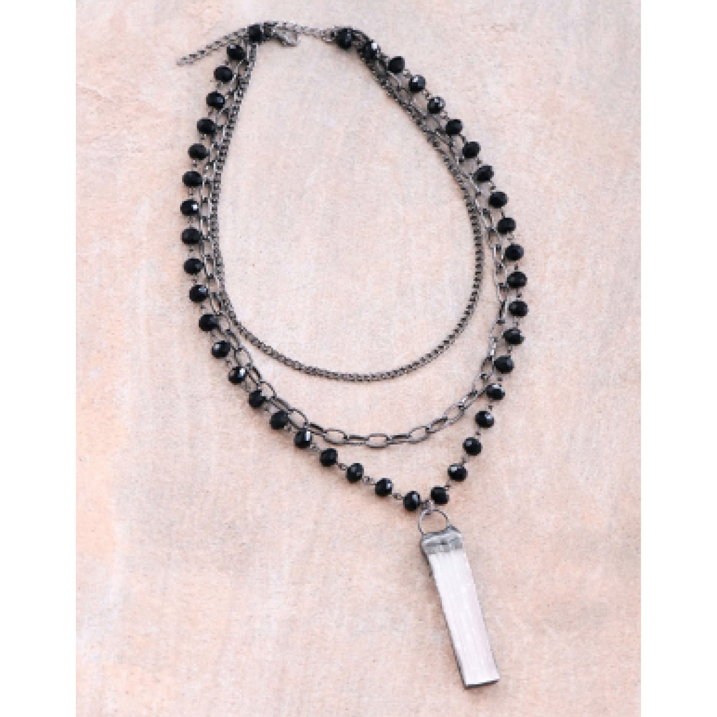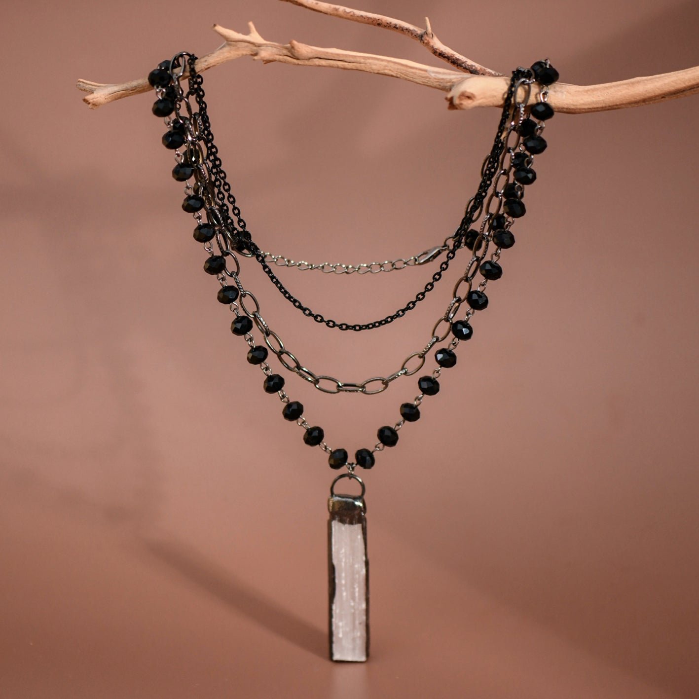 Layered Beaded Link Chain Necklace With Raw Quartz Crystal Stone Pendant.