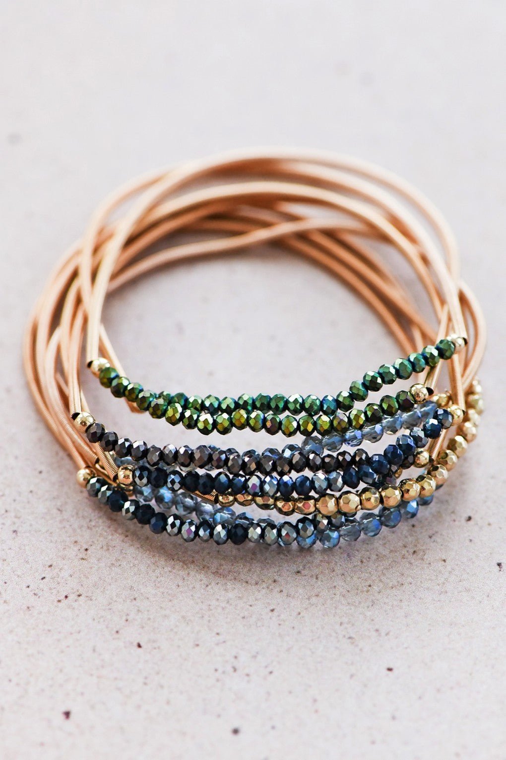 This trendy layered bracelet set features flexible spring coil bands, often known as guitar string bracelets, accented with shimmering crystal beads for a bold stacked look. The stretchy design allows for comfortable wear while creating effortless layered glam.