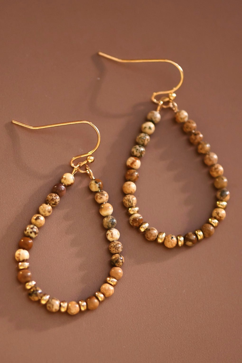 Brown Jasper Stone Beaded Teardrop Wire Earrings.