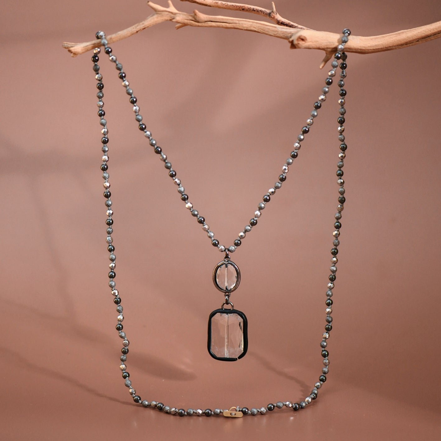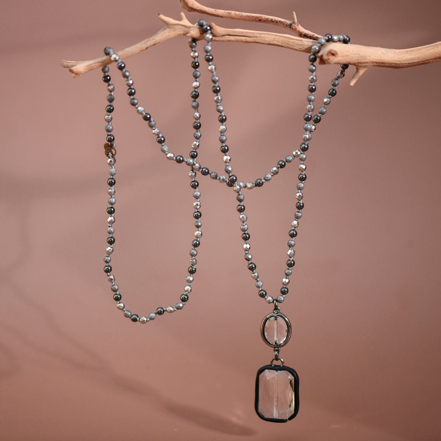 Clear Glass Crystal Pendant Necklace | Knotted Bead Necklace | Gray Necklace | Delicate Long Necklace | Boho Necklace | Beaded Chain Necklace | Beaded Necklace
