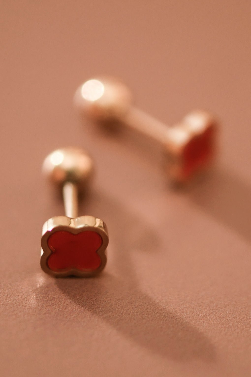 18K Gold Plated Stainless Steel Clover Stud Earrings with Red Crystals.