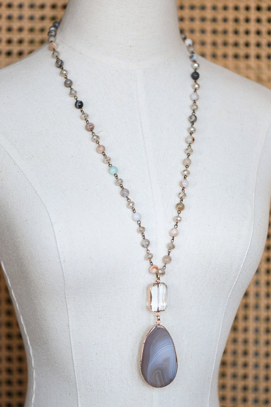 Agate Stone Bead Necklace with Agate Pendant.