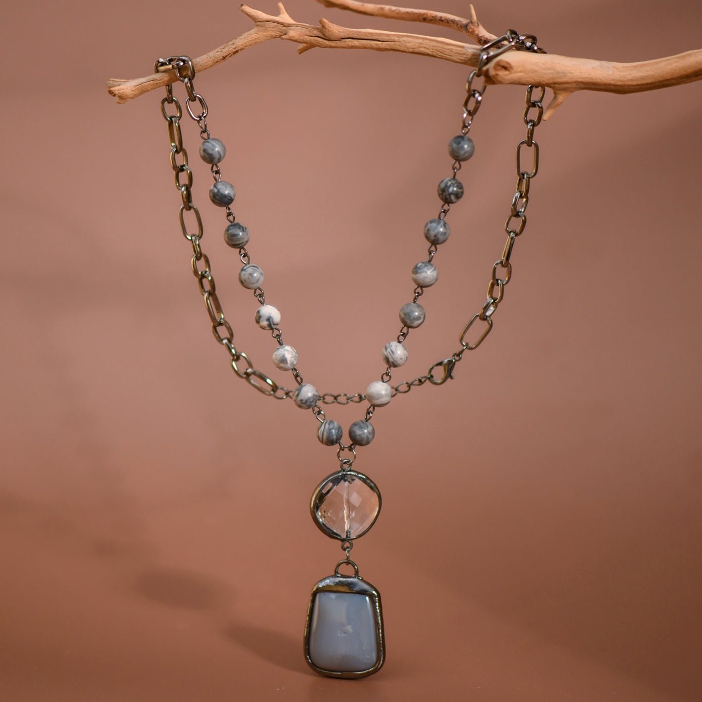 Gray Agate Stone Pendant Beaded Chain Link Necklace.
