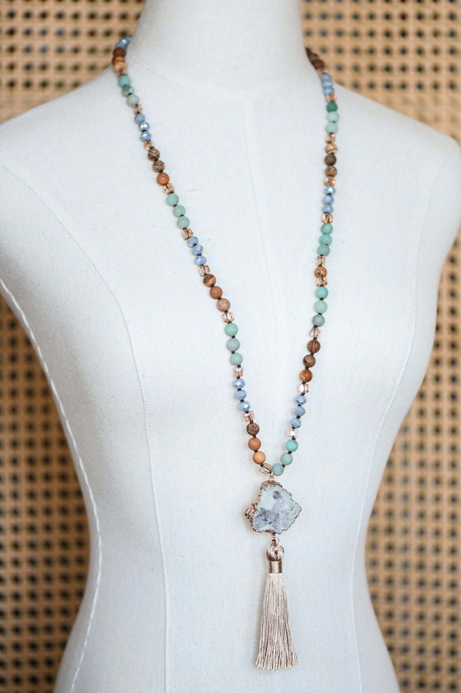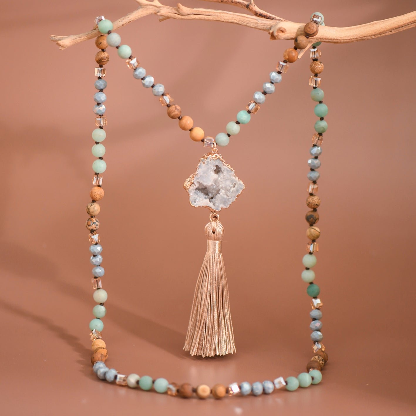 Stone Bead Necklace with Druzy Tassel Pendant.