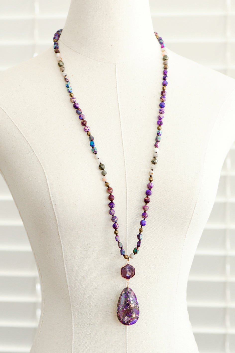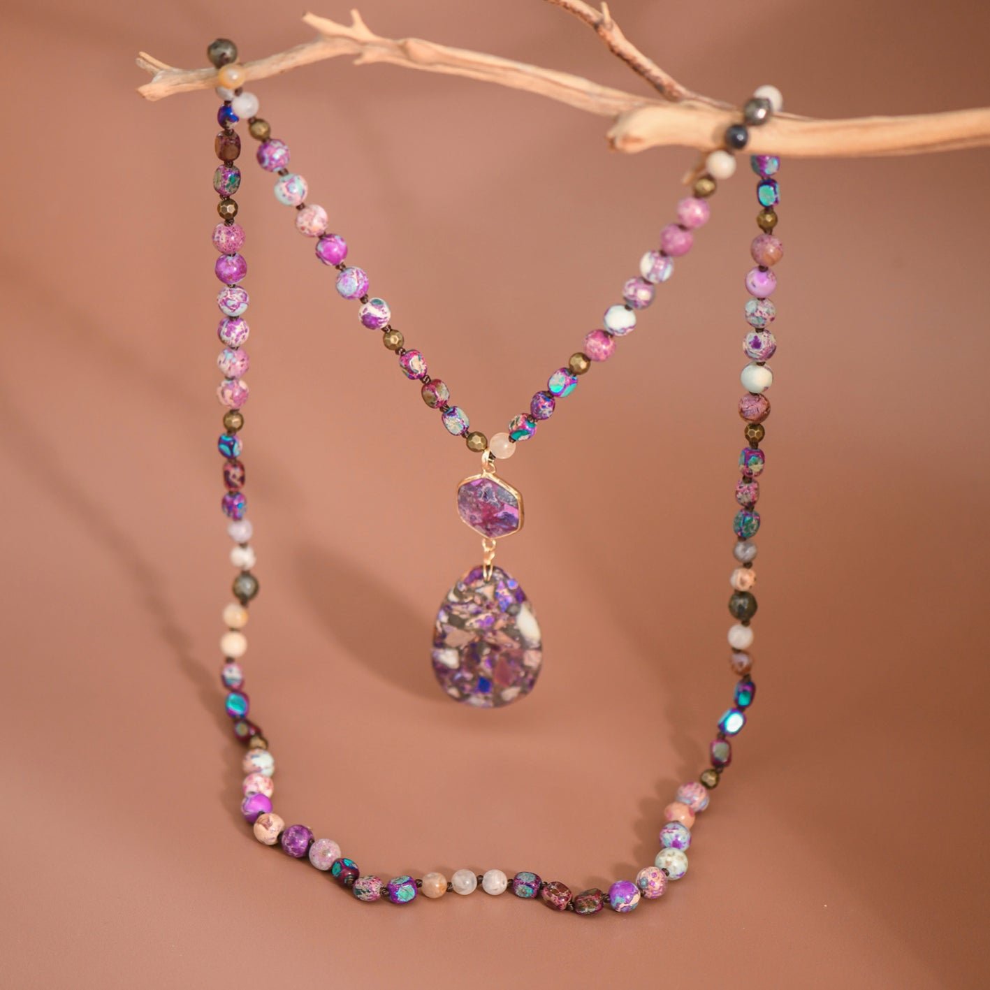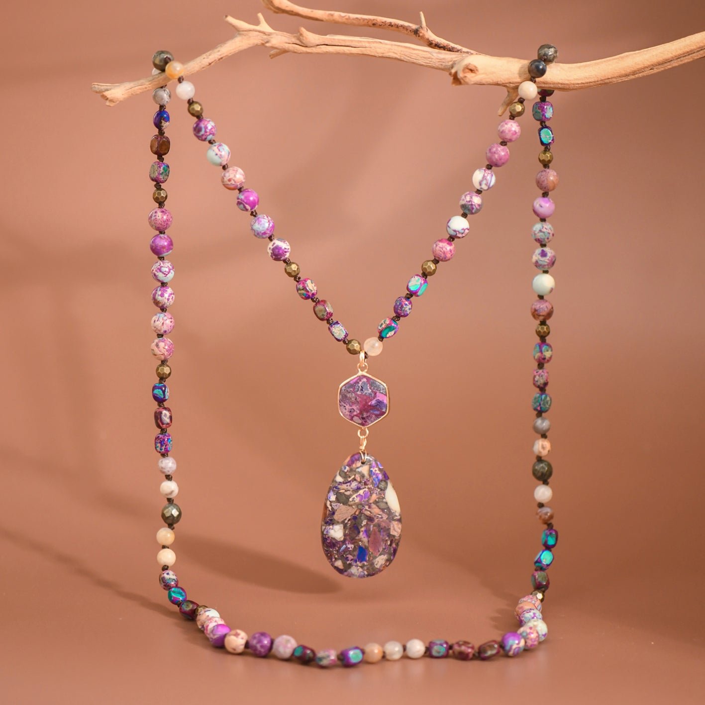 Purple Sea Sediment Imperial Jasper Necklace | Healing Crystal Necklace | Statement Necklace | Chunky Necklace | Protection Necklace | Long Necklace | Multi Gemstone Necklace | Boho Necklace | Natural Semi Precious Stone Necklace | Real Stone Necklace | Knotted Bead Necklace | Beaded Necklace | Large Crystal Pendant Necklace