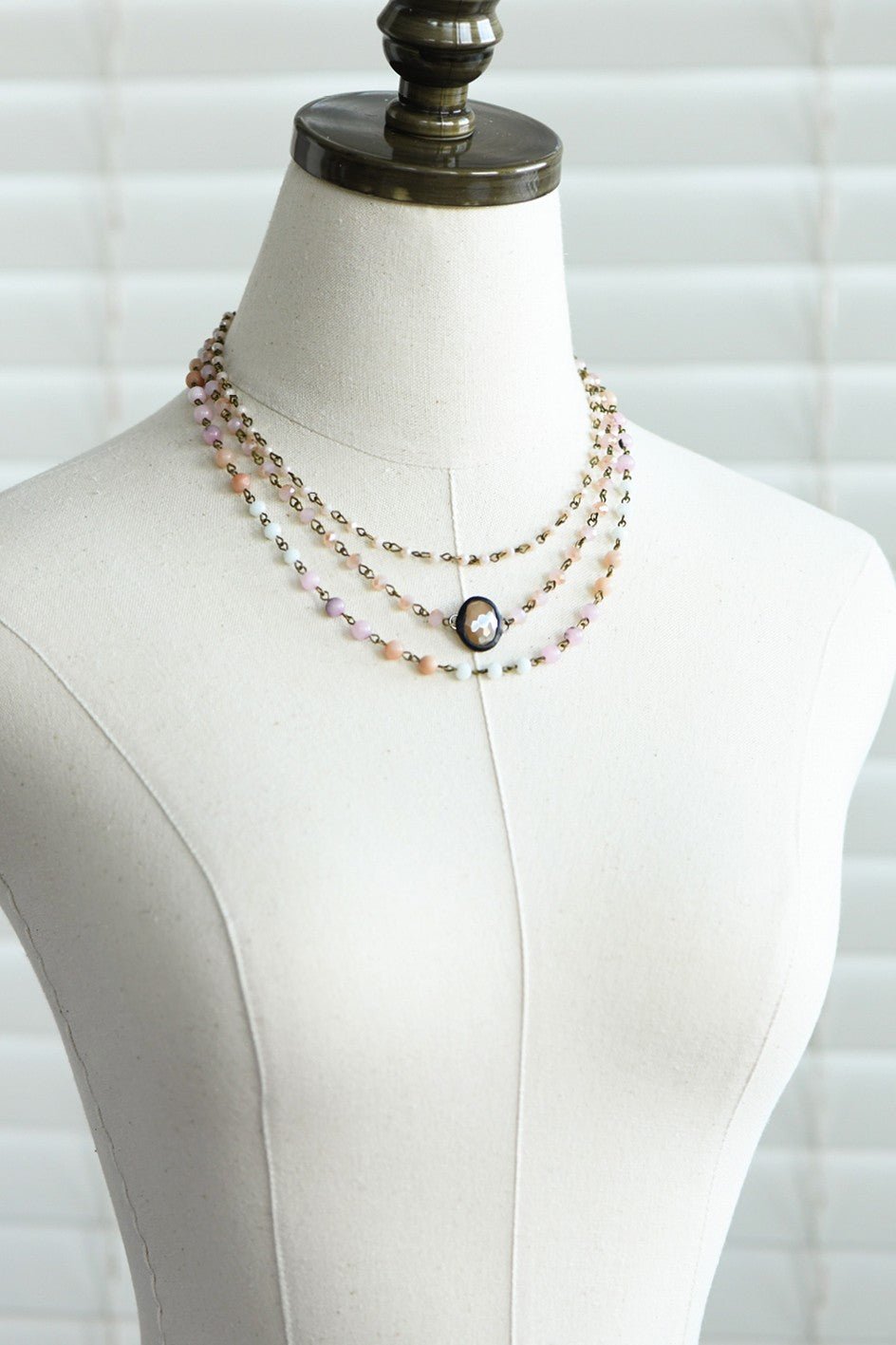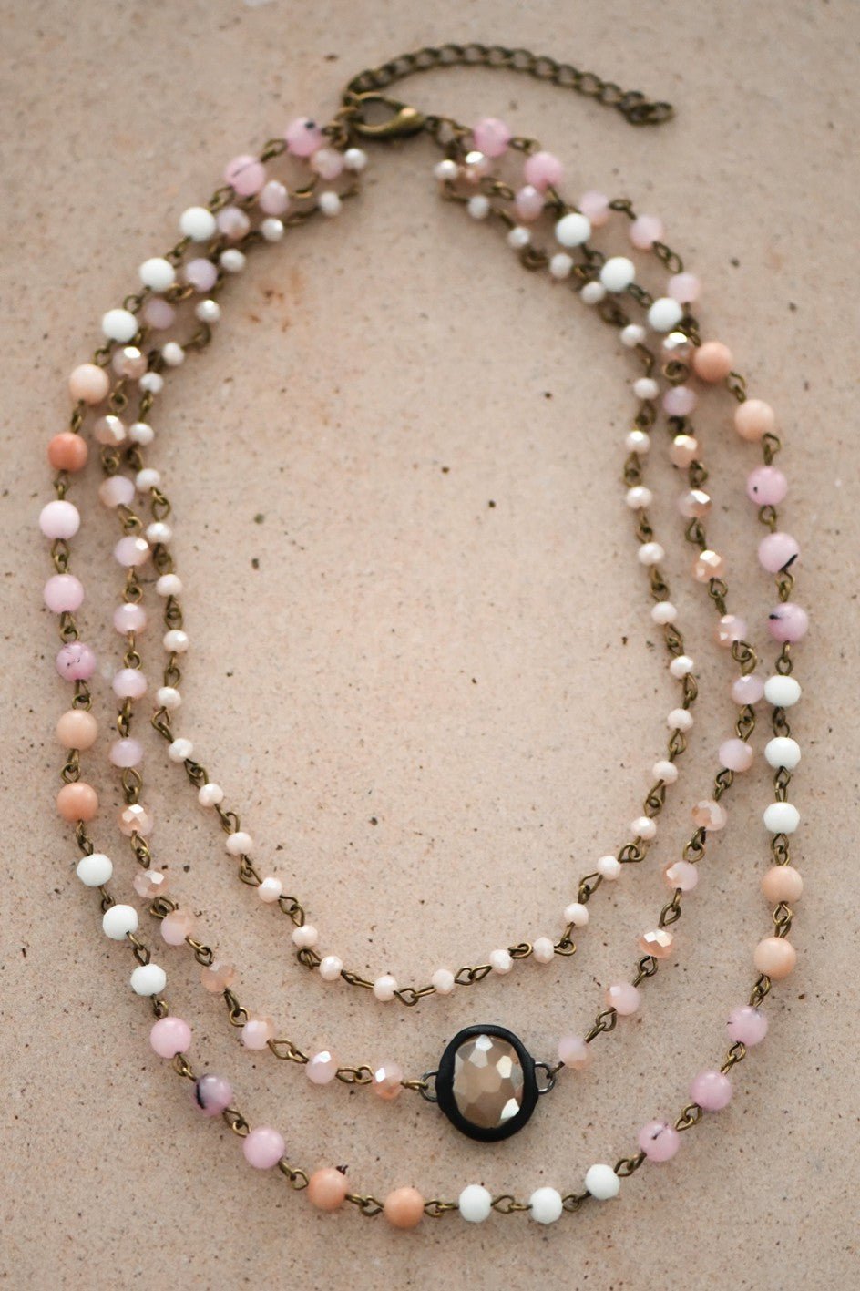 Triple Layered Mixed Glass Bead and Stone Necklace.