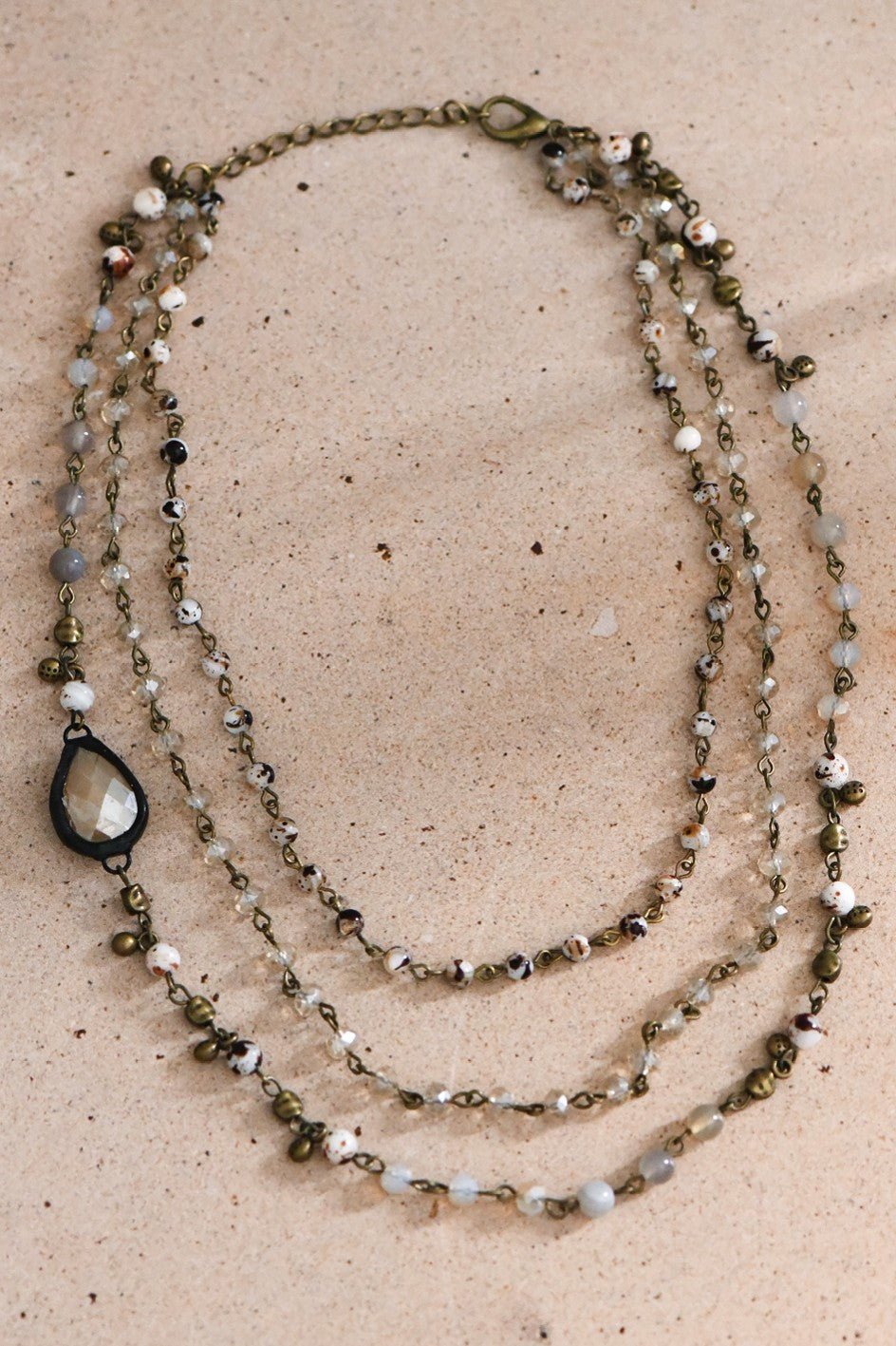 Triple Layered Mixed Glass Bead and Stone Necklace.